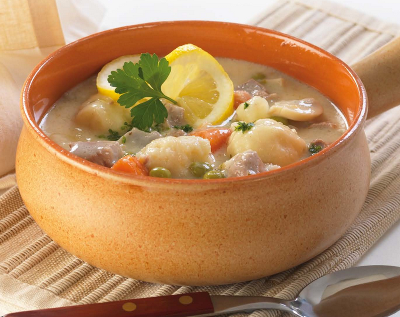 A húsból a zöldségekkel levest főzünk, melyet világos rántással sűrítünk. Betétként burgonyagombócot, gombát és zöldborsót főzünk bele. A tűzről levett levesbe keverjük a tejszínnel elkavart tojás sárgáját. Ezután már főzni nem szabad. Tálaláskor citromlével, petrezselyem zölddel ízesítjük.