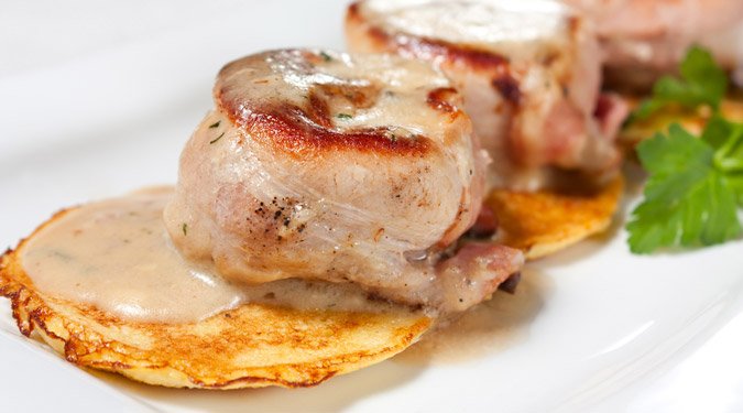 A sertéscombból 3 dkg-os érméket szeletelünk, kiverjük, majd sózzuk és kevés zsírban natúran lesütjük. A füstölt szalonnát és a sonkát kockára vágjuk, hagymás zsíron megpirítjuk. Összekeverjük a natúrlecsóval és a zöldborsóval. Közben a burgonyát meghámozzuk, megfőzzük. Áttörjük és tojással, liszttel összekeverjük. Lángosokat formázunk belőle, amiket kevés olajjal palacsintasütőben megsütünk. Tálaláskor minden tányérra egy lángost teszünk, szélére rakjuk a megsütött húsérméket, középre halmozzuk a lecsós, zöldborsós ragut. Forrón tálaljuk.