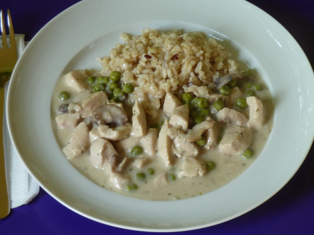 A megtisztított csirkét feldaraboljuk, sózzuk, borsozzuk, majd a vajon megpirítjuk. A szalonnát apró kockákra vágva kiolvasztjuk, megpirítjuk benne a vöröshagymát, hozzáöntjük a csirkéhez és kevés vízzel puhára pároljuk. Ha kész, hozzáadjuk a zöldborsót. Tálaláskor ráöntjük a tejszínt, belemorzsoljuk a maradék vajat és meghintjük petrezselyem zölddel. Vajas burgonyát vagy rizst adunk hozzá.