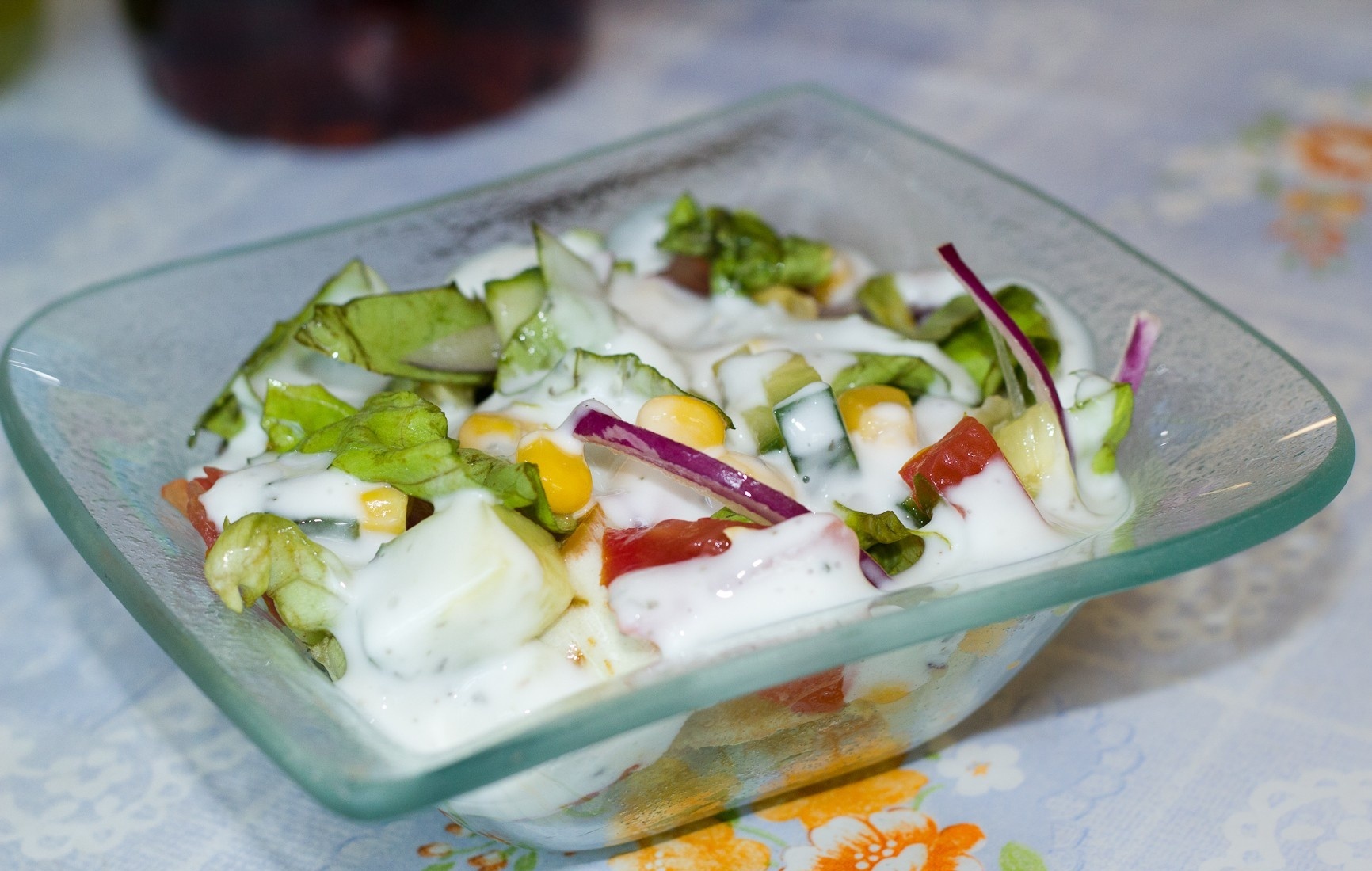A gyümölcsöket és a zöldségeket apróra vágjuk és összekeverjük. Hozzáadjuk a finomra vágott tárkonylevelet, a leszűrt citromlevet, a majonézt, a porcukrot, a sót és a megmosott, csíkokra vágott fejes salátát. Hűtőben hagyjuk összeérni.
