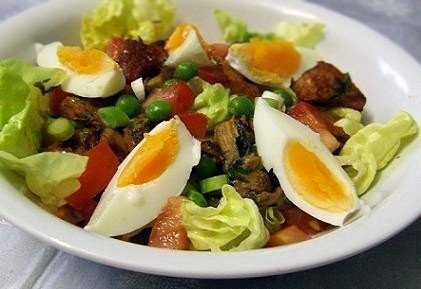 Keverőedénybe tesszük a porcukorral, mustárral, fehérborral, sóval, finomra vágott zöldpetrezselyemmel ízesített és elkevert majonézt, majd belekeverjük a leszűrt zöldborsókonzervet és a kockára vágott, főtt halat. Üvegtálban kínáljuk, melyet előzetesen kibéleltünk salátalevéllel. A saláta tetejét főtt tojáskarikákkal díszítjük.