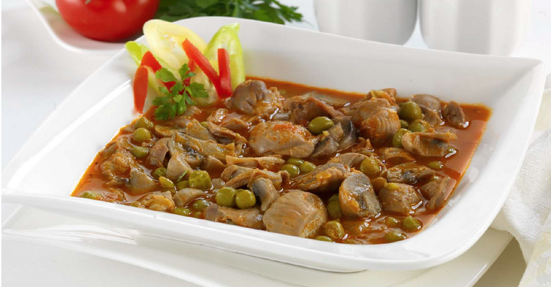 A megtisztított, felaprított zúzákat hagymás olajon megpirítjuk, sózzuk, borsozzuk, majd kevés vízzel puhára pároljuk. Ha kész, hozzáadjuk a zöldborsót és a lecsót. A kolozsvári szalonnát felaprítjuk, zsírját kiolvasztjuk. Ebben megpirítjuk a maradék hagymát, beletesszük a tisztított gombát, sóval, borssal, ketchuppal ízesítjük, megpároljuk. A kifőtt makarónihoz adjuk, és ezzel körítjük a zúzapörköltet.